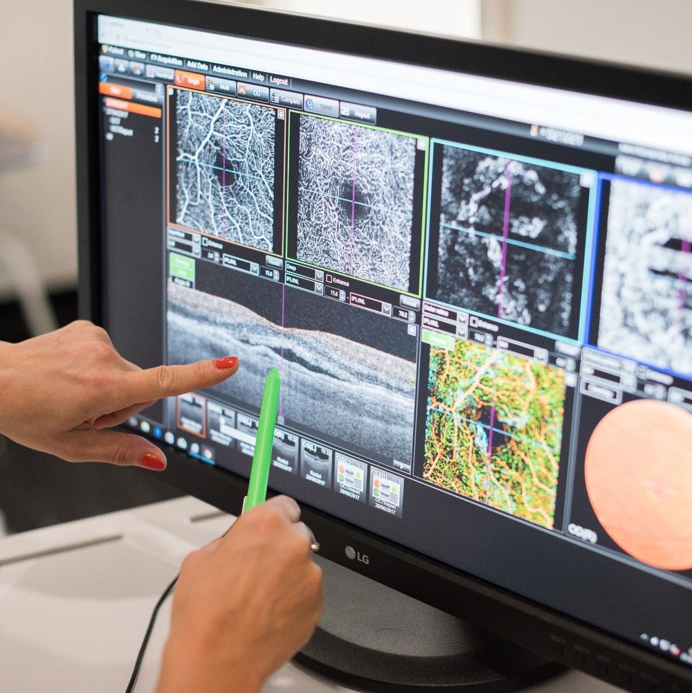 Identyfikacji i dokumentowania aktywności plamkowej/naczyniówkowej błony neowaskularnej (MNV/CNV) w różnych chorobach siatkówki, w tym w zwyrodnieniu plamki żółtej związanym z wiekiem (AMD), miopii itp.